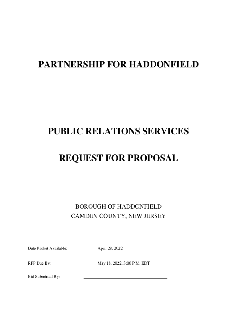 PARTNERSHIP FOR HADDONFIELDPUBLIC RELATIONS SERVICES REQUEST FOR PROPOSALBOROUGH OF HADDONFIELD CAMDEN COUNTY, New Jerseyan Packet Available:April 28, 2022RFP Due By:May 18, 2022, 3:00 P.M. Outbid