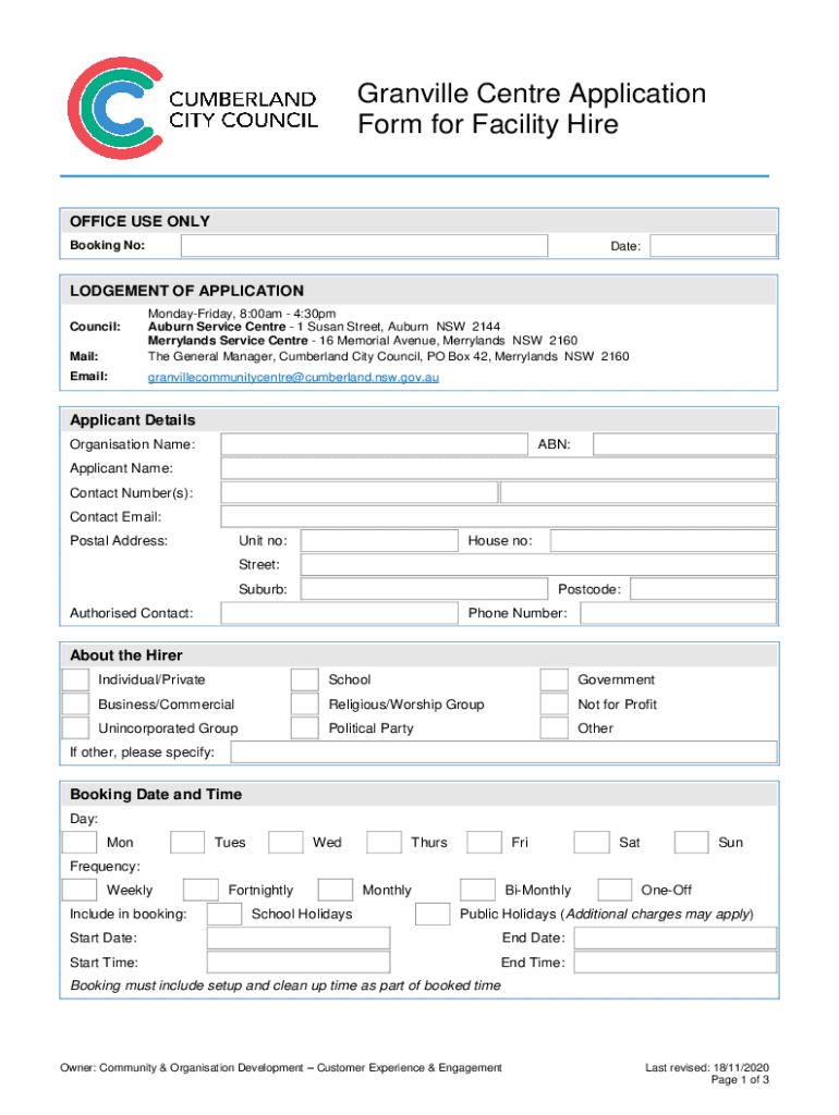 Granville Center Application Form for Facility LibreOffice USE ONLY Booking No:Date:JUDGEMENT OF APPLICATIONMail:Monday Friday, 8:00am 4:30pm Auburn Service Center 1 Susan Street, Auburn NSW 2144
