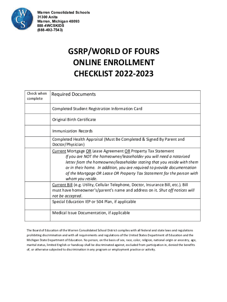 Warren Consolidated Schools 31300 Anita Warren, Michigan 48093 8884WCSKIDS (8884927543)GRP/WORLD OF FOURS ONLINE ENROLLMENT CHECKLIST 20222023 Check when completeRequired Documents Completed Student