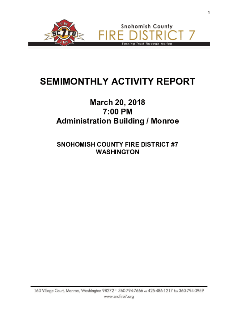 1SEMIMONTHLY ACTIVITY REPORT March 20, 2018 7:00 PM Administration Building / Monroe SNOHOMISH COUNTY FIRE DISTRICT #7 WASHINGTON2AGENDA3BOARD OF FIRE COMMISSIONERS REGULAR MEETING AGENDA Snohomish