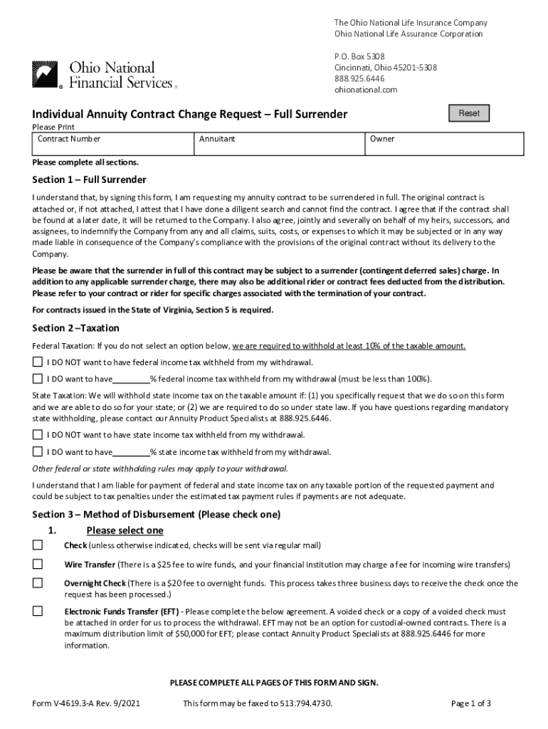 The Ohio National Life Insurance Company Ohio National Life Assurance Corporation P.O. Box 5308 Cincinnati, Ohio 452015308 888.925.6446 binational. Individual Annuity Contract Change Request Full