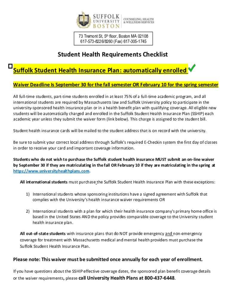 73 Tremont St, 5th floor, Boston MA 02108 6175738226/8260 (Fax) 6173051745Student Health Requirements Dear Students: Please read the following information in order to better understand your student