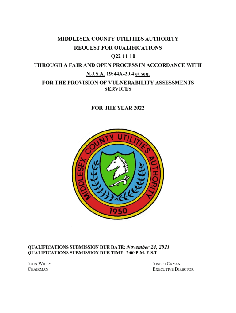 MIDDLESEX COUNTY UTILITIES AUTHORITY REQUEST FOR QUALIFICATIONS Q221110 THROUGH A FAIR AND OPEN PROCESS IN ACCORDANCE WITH N.J.S.A. 19:44A20.4 et seq. FOR THE PROVISION OF VULNERABILITY ASSESSMENTS