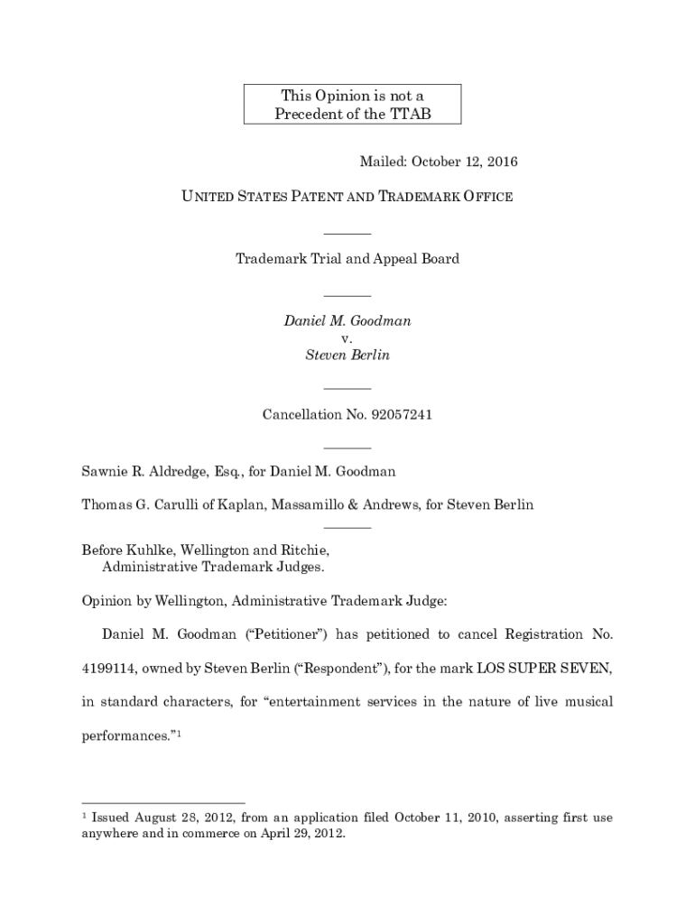 This Opinion is not a Precedent of the STAB Mailed: October 12, 2016UNITED STATES PATENT AND TRADEMARK OFFICE ___ Trademark Trial and Appeal Board ___ Daniel M. Goodman v. Steven Berlin ___ Cancellation