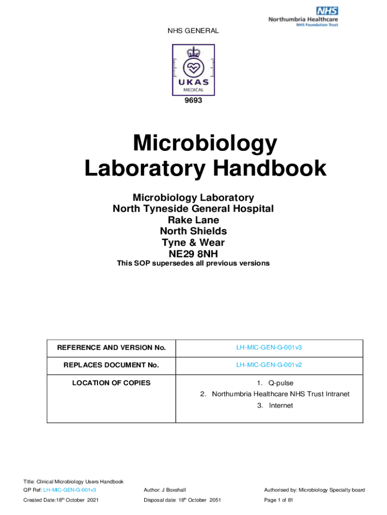 NHS GENERAL9693Microbiology Laboratory Handbook Microbiology Laboratory North Inside General Hospital Rake Lane North Shields Type & Wear NE29 8NH This SOP supersedes all previous versionsREFERENCE