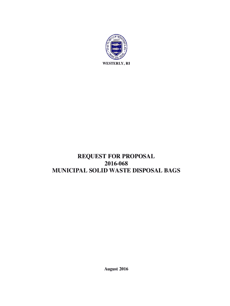 WESTERLY, REQUEST FOR PROPOSAL 2016068 MUNICIPAL SOLID WASTE DISPOSAL BAGS August 2016REQUEST FOR PROPOSAL 2016068 MUNICIPAL SOLID WASTE DISPOSAL BAGS Separate sealed proposals will be received by