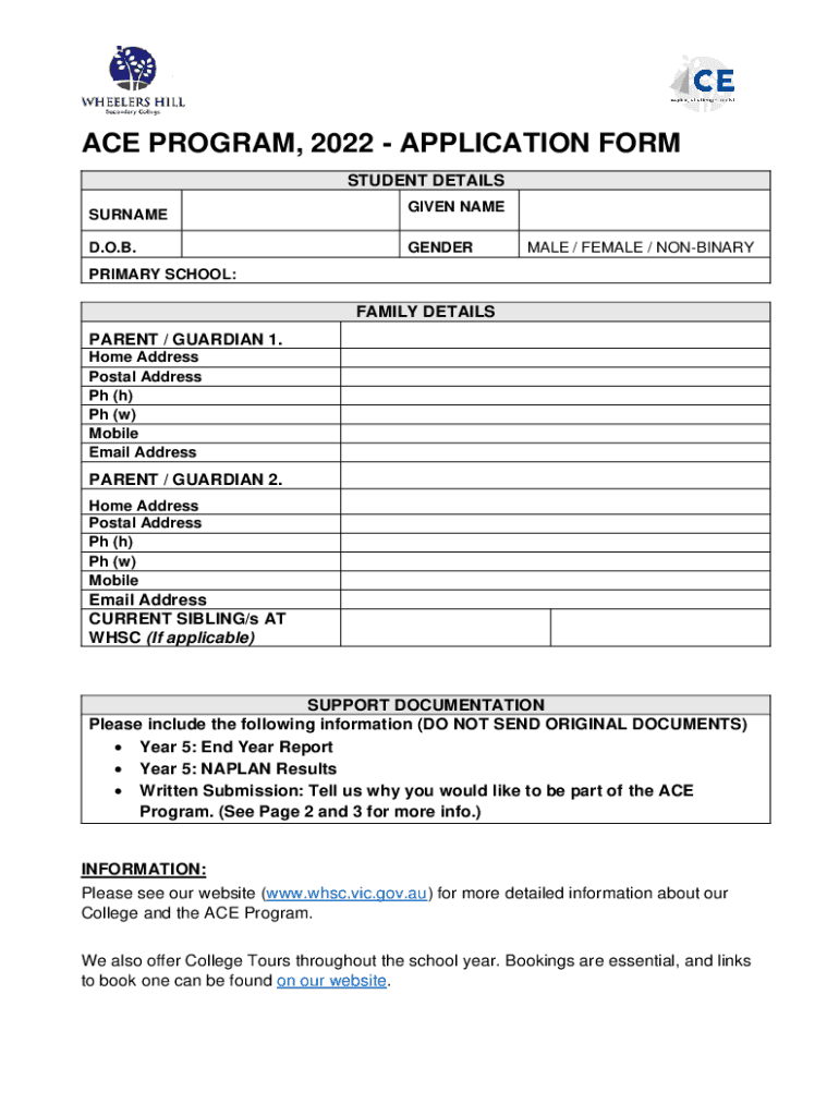 ACE PROGRAM, 2022 APPLICATION FORM STUDENT DETAILS SURNAME D.O.B.GIVEN NAME GENDER MALE / FEMALE / NONBINARYPRIMARY SCHOOL:FAMILY DETAILS PARENT / GUARDIAN 1. Home Address Postal Address pH (h) pH