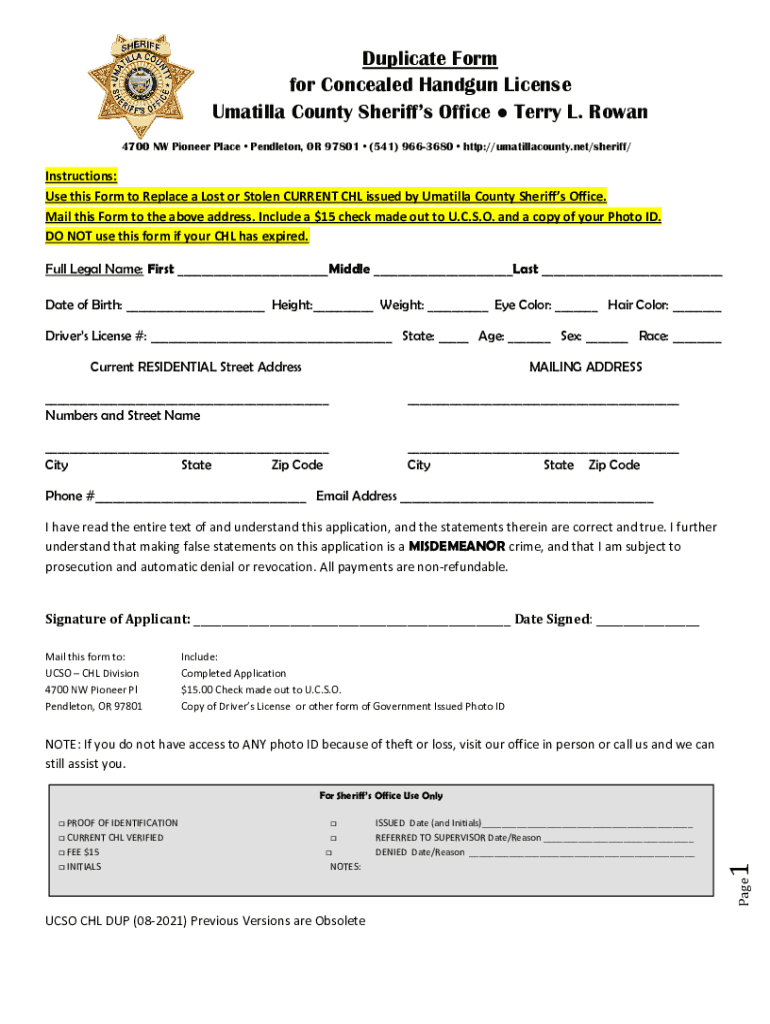 Duplicate Form for Concealed Handgun License Umatilla County Sheriffs Office Terry L. Rowan 4700 NW Pioneer Place Pendleton, OR 97801 (541) 9663680 http://umatillacounty.net/sheriff/Instructions: