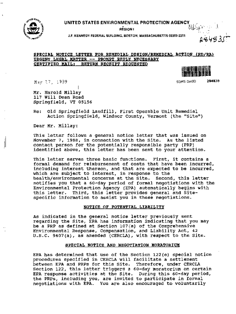 F.r.UNITED STATES ENVIRONMENTAL PROTECTION AGENCY. F. KENNEDY FEDERAL BUILDING, BOSTON, MASSACHUSETTS 022032211SPECIAL NOTICE LETTER FOR REMEDIAL DESIGN/REMEDIAL ACTION (RD/RA1URGENT LEGAL MATTER