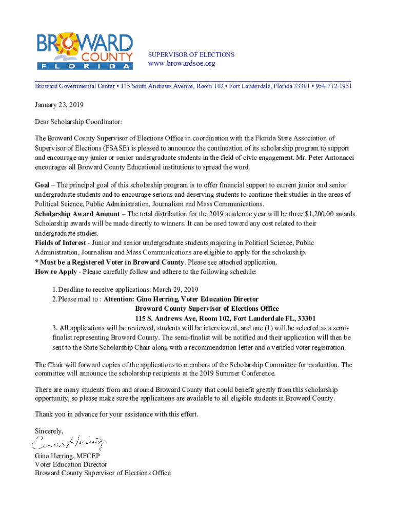 SUPERVISOR OF Elections. Broward.org___ Broward Governmental Center 115 South Andrews Avenue, Room 102 Fort Lauderdale, Florida 33301 9547121951January 23, 2019 Dear Scholarship Coordinator: The Broward