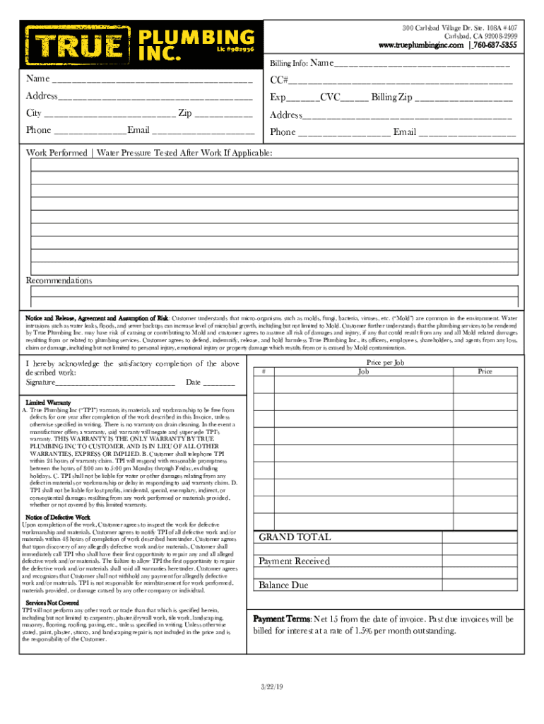 300 Carlsbad Village Dr. Ste. 108A #407 Carlsbad, CA 920082999www.trueplumbinginc.com | 7606375355 Billing Info: Name___Name ___CC#___Address___Exp___CVC___ Billing Zip ___City ___ Zip ___Address___Phone
