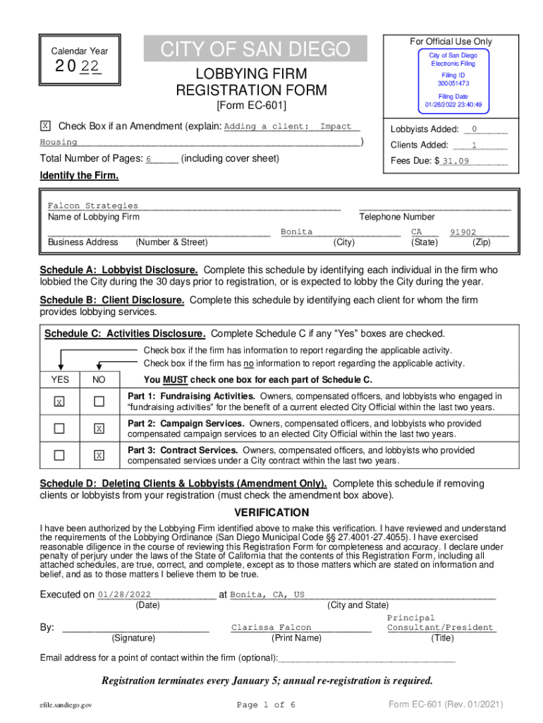 For Official Use Velocity OF SAN DIEGOCalendar Year22_ 20_City of San Diego Electronic FilingLOBBYING FIRM REGISTRATION Formfitting ID 300051473 Filing Date 01/28/2022 23:40:49[Form EC601] Adding