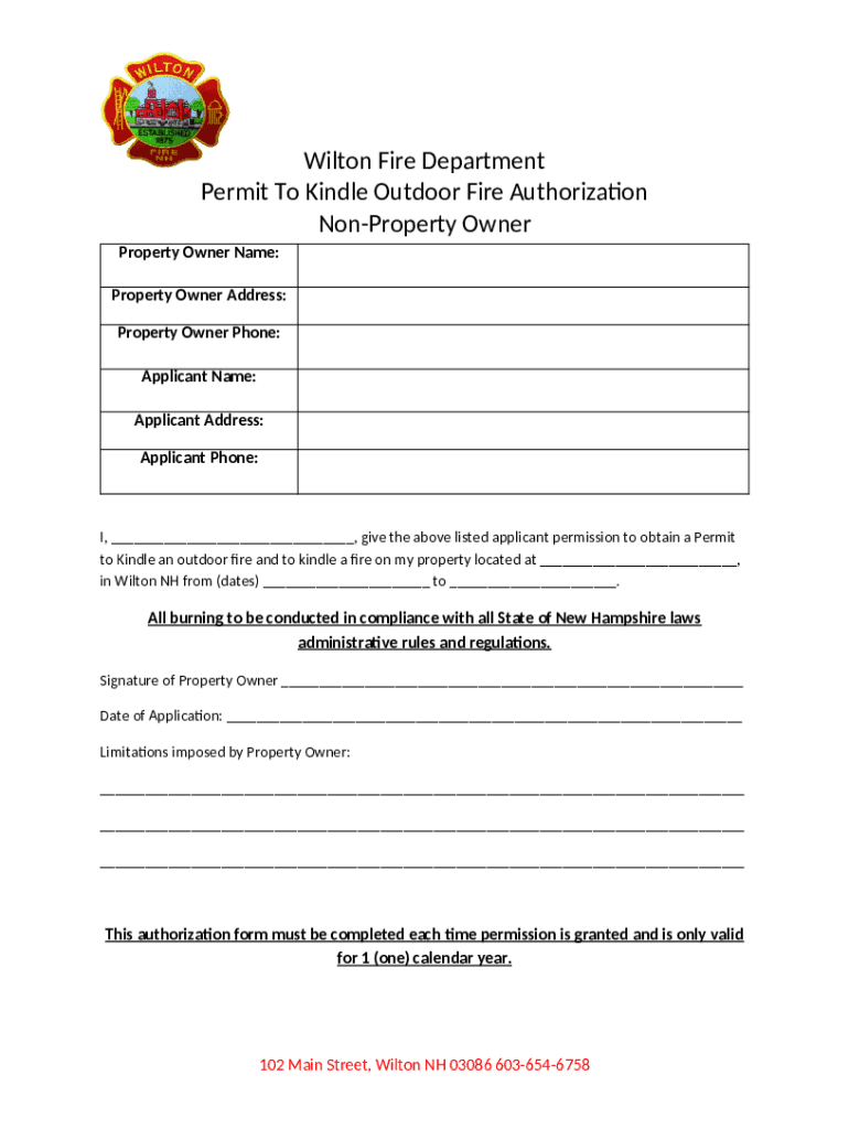 Wilton Fire Department Permit Kindling Outdoor Fire Authorization Property Owner Name: Property Owner Address: Property Owner Phone: Applicant Name: Applicant Address: Applicant Phone:I, ___, give