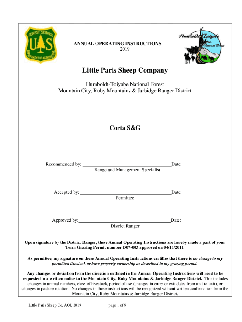 ANNUAL OPERATING INSTRUCTIONS 2019Little Paris Sheep Company HumboldtToiyabe National Forest Mountain City, Ruby Mountains & Carbide Ranger DistrictCorta Recommended by:Date: ___ Rang eland Management