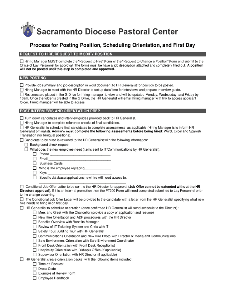 Sacramento Diocese Pastoral Center Process for Posting Position, Scheduling Orientation, and First Day REQUEST TO HIRE/REQUEST TO MODIFY POSITION Hiring Manager MUST complete the Request to Hire Form