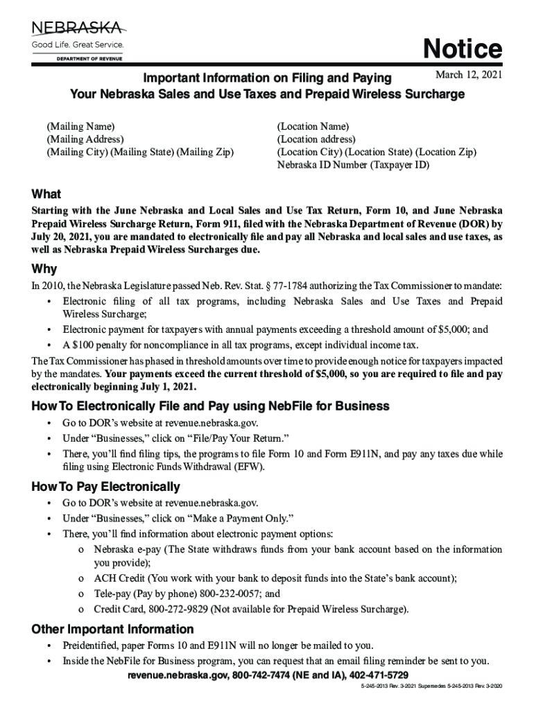 Notice March 12, 2021, Important Information on Filing and Paying Your Nebraska Sales and Use Taxes and Prepaid Wireless Surcharge(Mailing Name)(Mailing Address)(Mailing City) (Mailing State) (Mailing