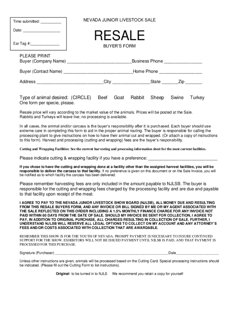Time submitted: ___NEVADA JUNIOR LIVESTOCK Stalemate: ___Ear Tag #:___RESALE BUYERS FORMULAS PRINT Buyer (Company Name) ___Business Phone ___ Buyer (Contact Name) ___Home Phone ___ Address ___City