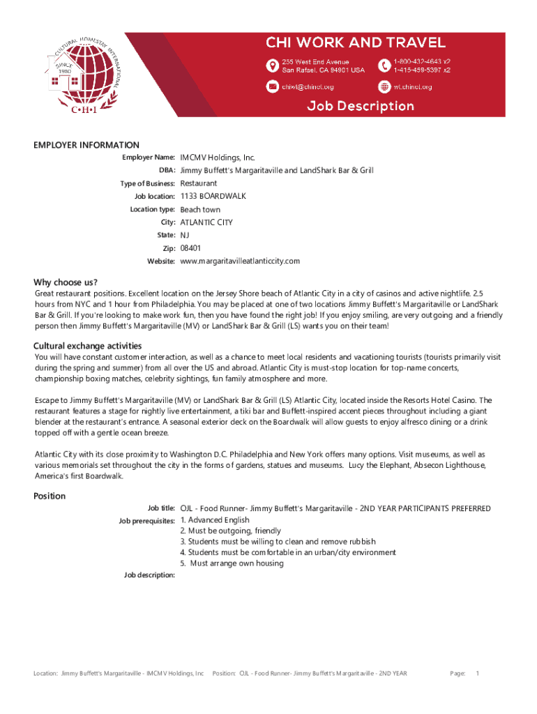 EMPLOYER INFORMATION Employer Name: IMC MV Holdings, Inc. DBA: Jimmy Buffett\'s Margaritaville and Land Shark Bar & Grill Type of Business: Restaurant Job location: 1133 BOARDWALK Location type: Beach