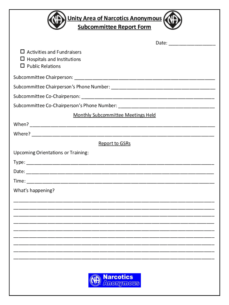 Unity Area of Narcotics Anonymous Subcommittee Report Form Date: ___ Activities and Fundraisers Hospitals and Institutions Public Relations Subcommittee Chairperson: ___ Subcommittee Chairpersons