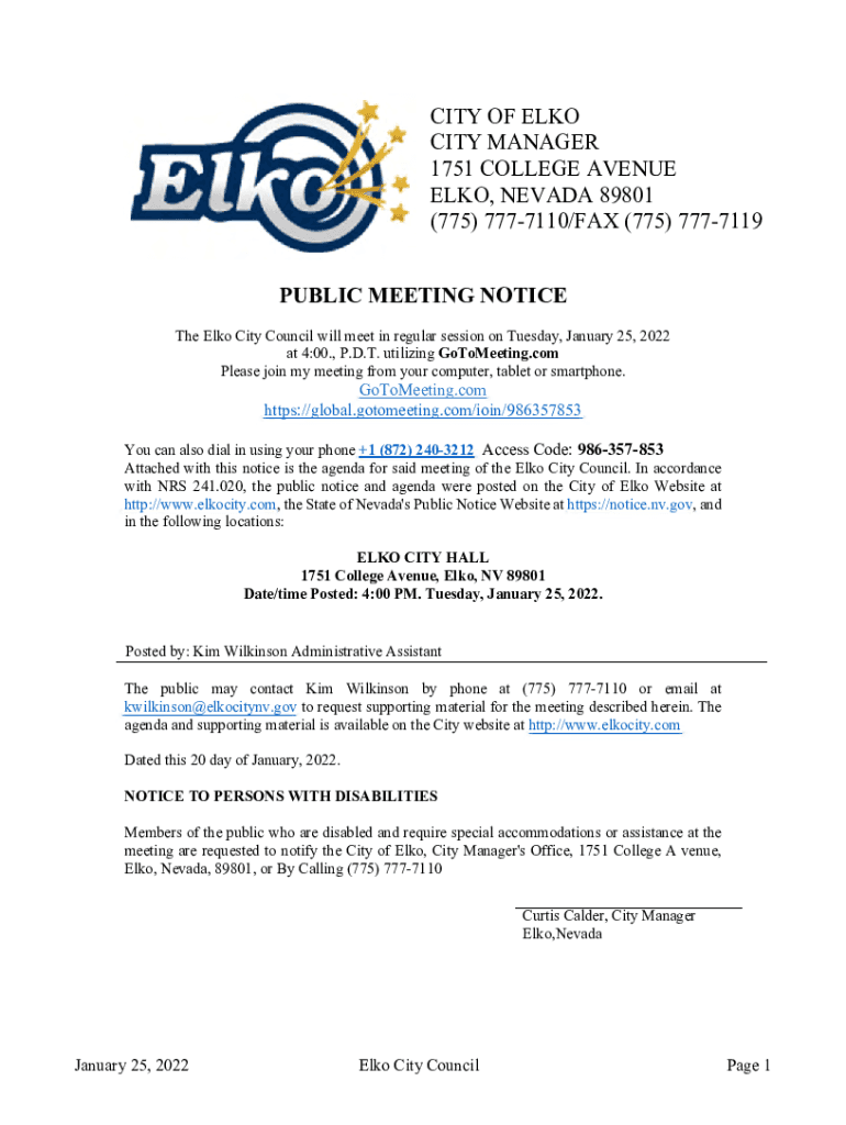 CITY OF ELK CITY MANAGER 1751 COLLEGE AVENUE ELK, NEVADA 89801 (775) 7777110/FAX (775) 7777119 PUBLIC MEETING NOTICE The Elk City Council will meet in regular session on Tuesday, January 25, 2022,