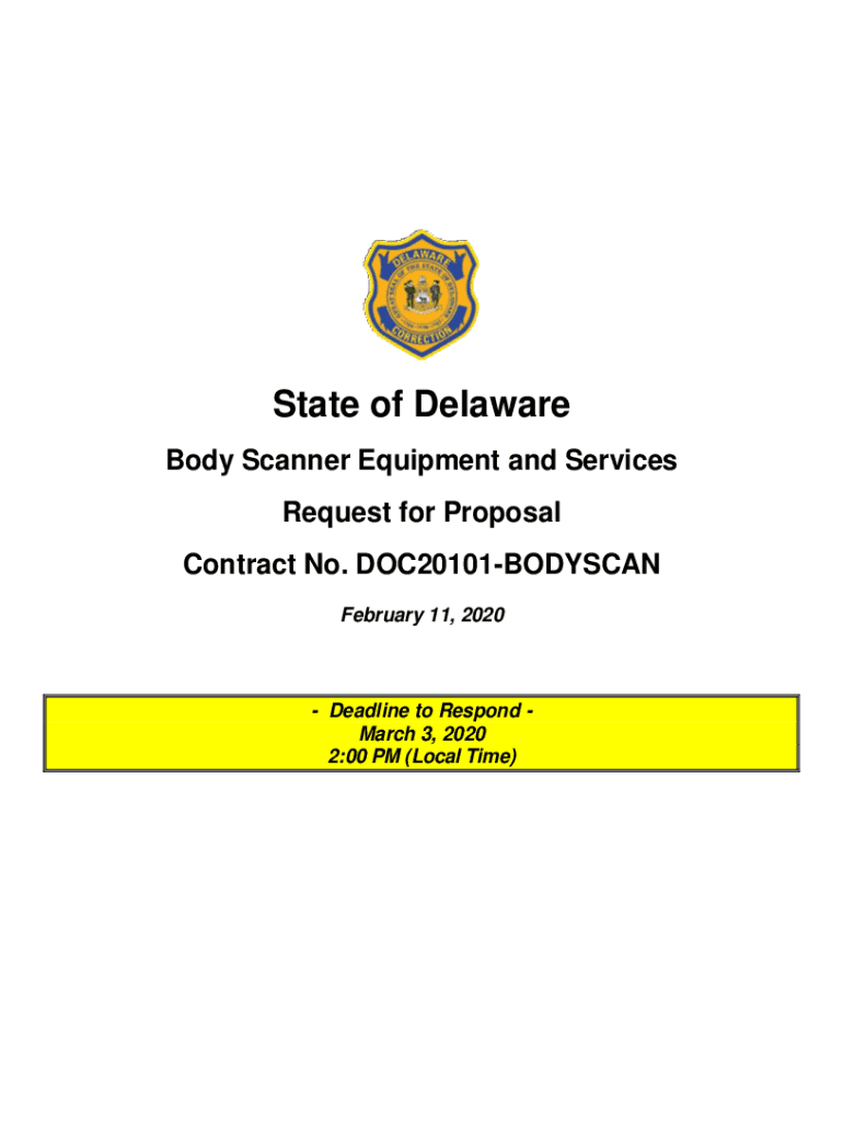 State of Delaware Body Scanner Equipment and Services Request for Proposal Contract No. DOC20101BODYSCAN February 11, 2020, Deadline to Respond March 3, 2020 2:00 PM (Local Time)STATE OF DELAWARE