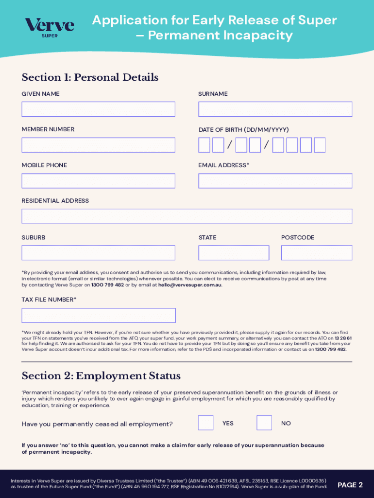 Application for Early Release of Super Permanent Incapacity ISSUED 11 JANUARY 2022 FUND ABN 45 960 194 277 | USI 45 960 194 277 020Complete this form to apply to make a withdrawal from your Verve