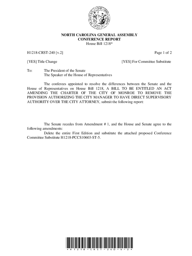 NORTH CAROLINA GENERAL ASSEMBLY CONFERENCE REPORT House Bill 1218* H1218CRST240 [v.2]Page 1 of 2[YES] Title Change To:[YES] For Committee Substitute President of the Senate The Speaker of the House