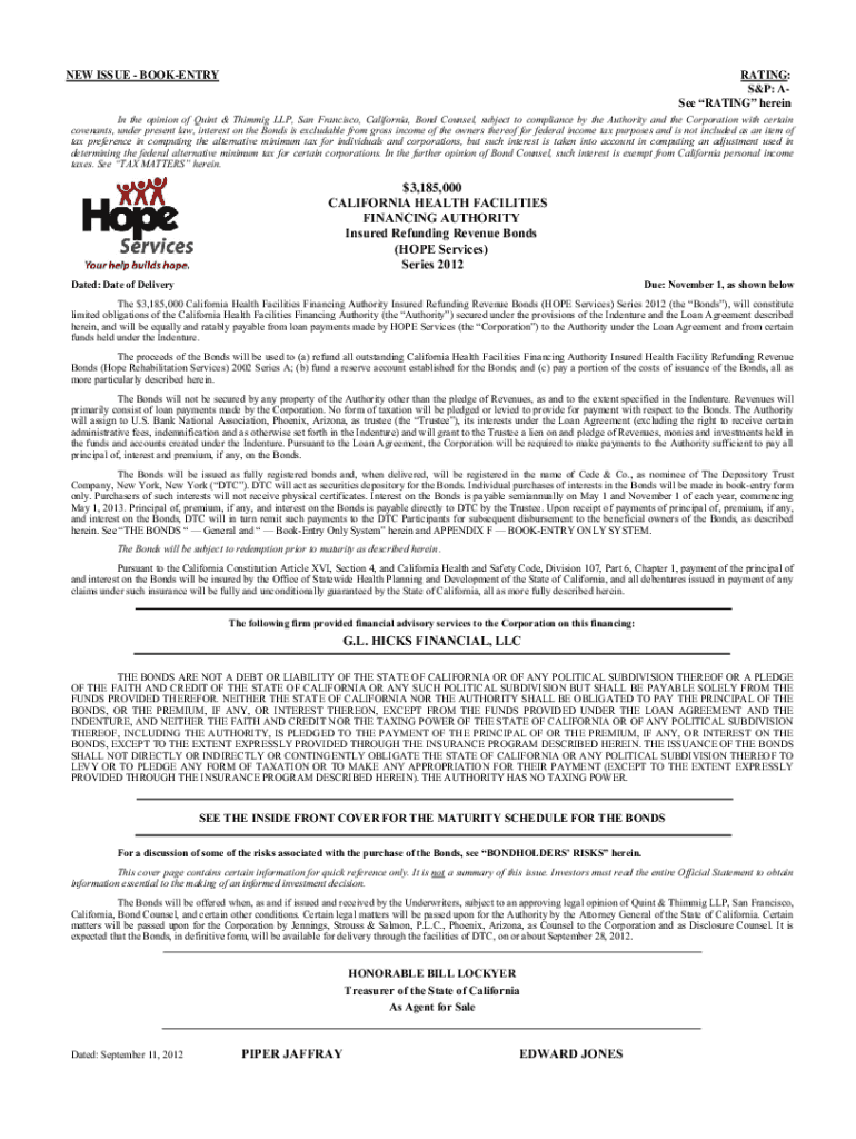RATING: S&P: See RATING hearing ISSUE BOOKENTRYIn the opinion of Quint & Trimming LLP, San Francisco, California, Bond Counsel, subject to compliance by the Authority and the Corporation with certain