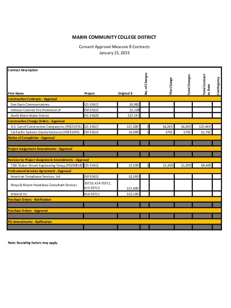 MARIN COMMUNITY COLLEGE DISTRICT Consent Approval Measure B Contracts January 15, 2019This ChangeTotal ChangesTotal Contract to Date Dan Davis CommunicationsI2135617Johnson Controls Fire Protection
