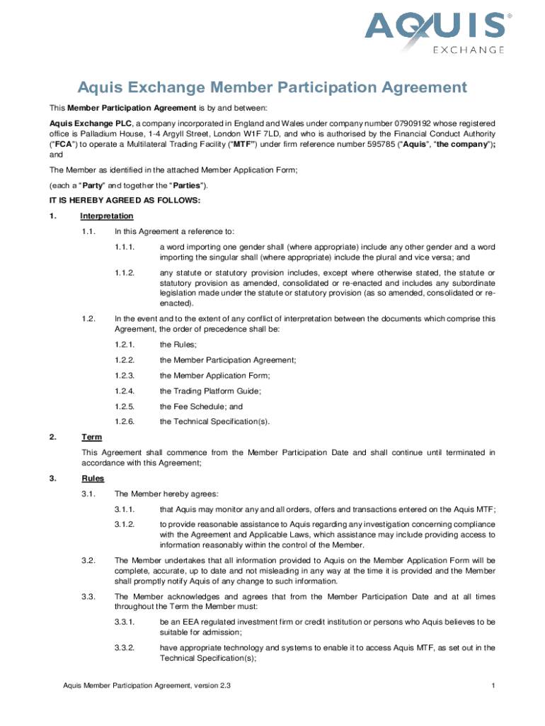Aquas Exchange Member Participation Agreement This Member Participation Agreement is by and between: Aquas Exchange PLC, a company incorporated in England and Wales under company number 07909192 whose