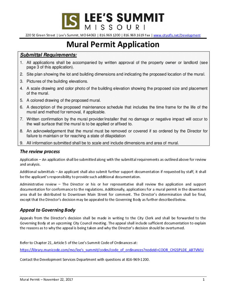 220 SE Green Street | Lee\'s Summit, MO 64063 | 816.969.1200 | 816.969.1619 Fax | www.cityofls.net/DevelopmentMural Permit Application Submittal Requirements: 1. All applications shall be accompanied
