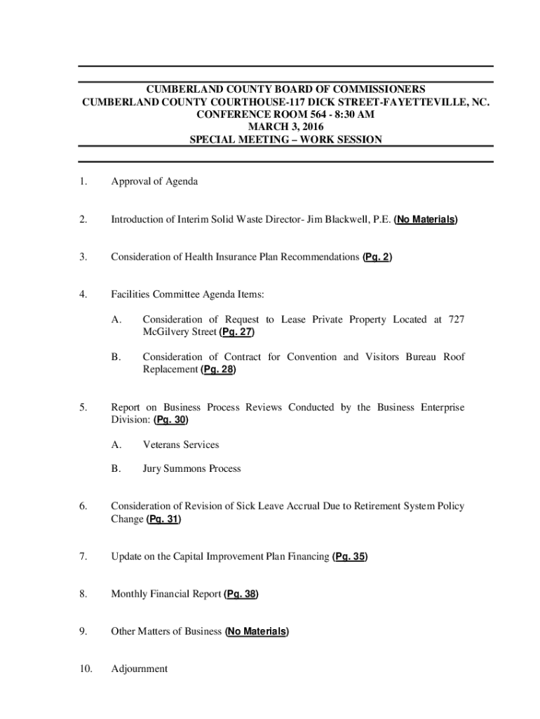 CUMBERLAND COUNTY BOARD OF COMMISSIONERS CUMBERLAND COUNTY COURTHOUSE117 DICK STREETFAYETTEVILLE, NC. CONFERENCE ROOM 564 8:30 AM MARCH 3, 2016, SPECIAL MEETING WORK SESSION1. Approval of Agenda2.