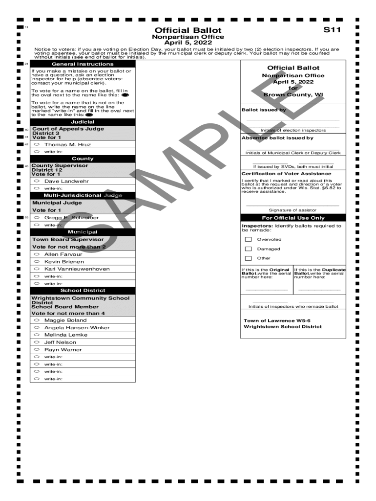 11S11Official Ballot Nonpartisan Office April 5, 2022Notice to voters: if you are voting on Election Day, your ballot must be initialed by two (2) election inspectors. If you are voting absentee,