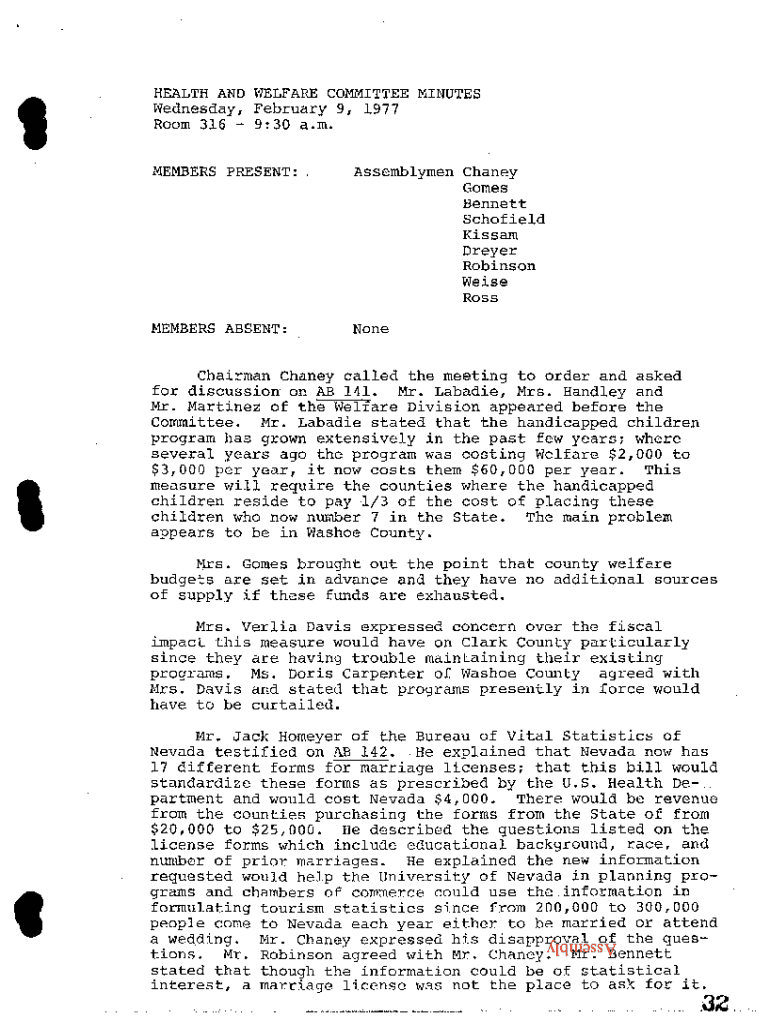 \'\'HEALTH AND WELFARE COMMITTEE MINUTES Wednesday, February 9, 1977, Room 316 9:30 a.m. MEMBERS PRESENT:. Assemblymen Chaney Gomes Bennett Schofield Kiss am Dreyer Robinson Was Remembers ABSENT:NoneChairman
