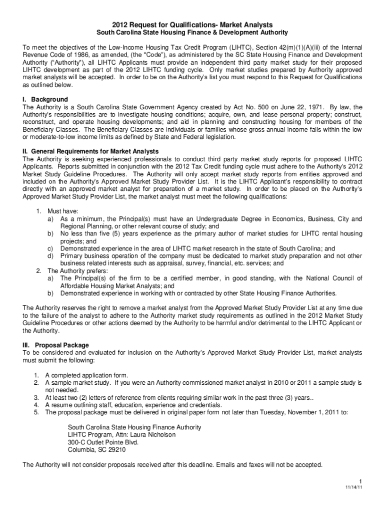 2012 Request for Qualifications Market Analysts South Carolina State Housing Finance & Development Authority To meet the objectives of the Income Housing Tax Credit Program (LIH TC), Section 42(m)(1)(A)(iii)