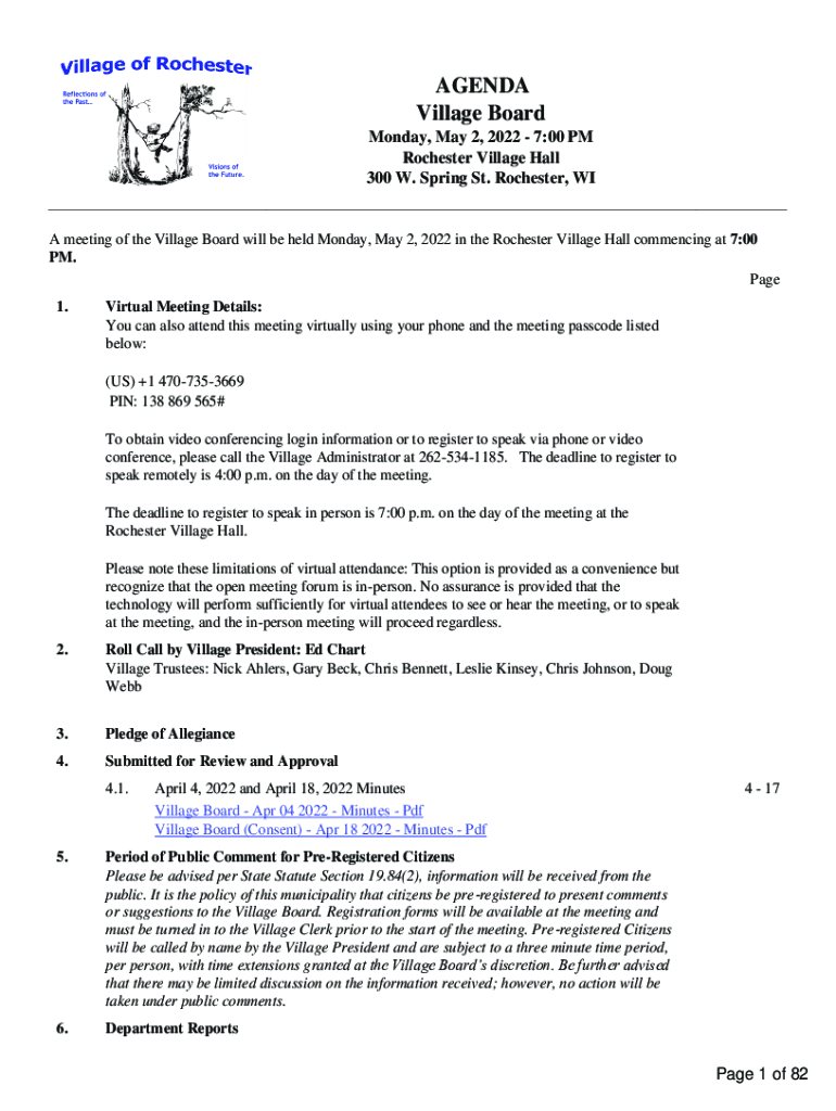 AGENDA Village Board Monday, May 2, 2022 7:00 PM Rochester Village Hall 300 W. Spring St. Rochester, WIA meeting of the Village Board will be held Monday, May 2, 2022, in the Rochester Village Hall