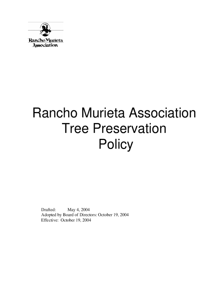 Rancho Murrieta Association Tree Preservation PolicyDrafted: May 4, 2004, Adopted by Board of Directors: October 19, 2004, Effective: October 19, 2004Table of Contents Page General Policy I. Definitions.
