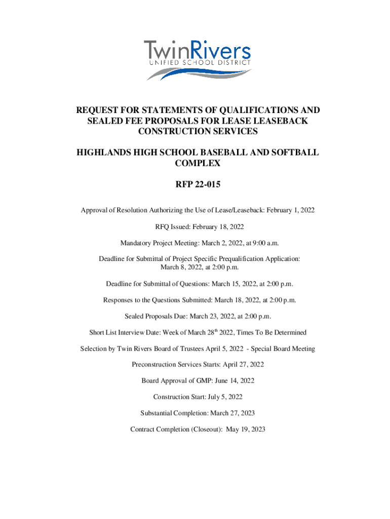 REQUEST FOR STATEMENTS OF QUALIFICATIONS AND SEALED FEE PROPOSALS FOR LEASE LEASEBACK CONSTRUCTION SERVICES HIGHLANDS HIGH SCHOOL BASEBALL AND SOFTBALL COMPLEX RFP 22015 Approval of Resolution Authorizing