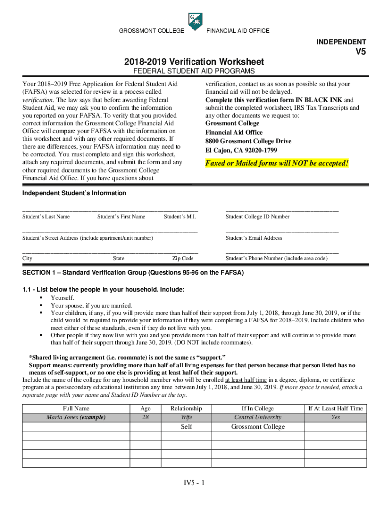 GROSSMAN COLLEGEFINANCIAL AID OFFICEINDEPENDENTV5 20182019 Verification Worksheet FEDERAL STUDENT AID PROGRAMS Your 20182019 Free Application for Federal Student Aid (FAFSA) was selected for review