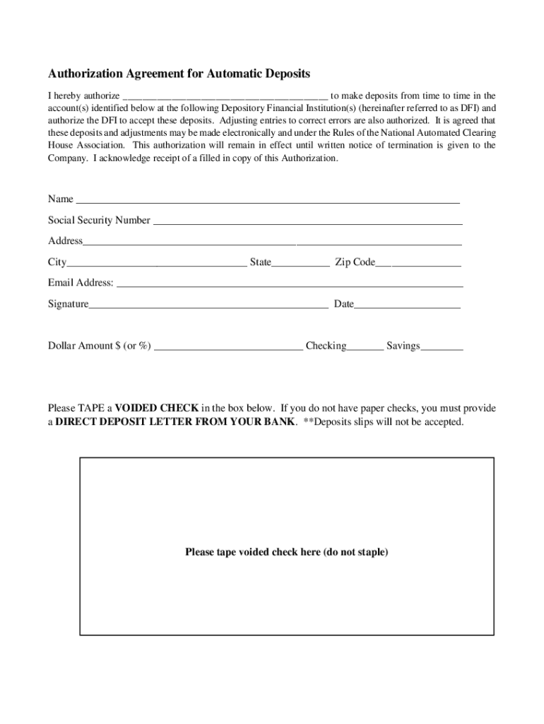 Authorization Agreement for Automatic Deposits I hereby authorize ___ to make deposits from time to time in the account(s) identified below at the following Depository Financial Institution(s) (hereinafter