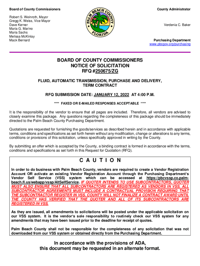 Board of County CommissionersCounty Administrator Robert S. Earth, Mayor Gregg K. Weiss, Vice Mayor Dave Kernel Maria G. Marino Maria Sachs Melissa McKinley Mack BernardVerdenia C. BakerPurchasing