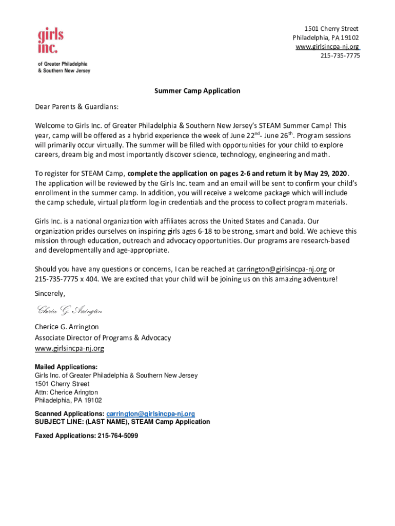 1501 Cherry Street Philadelphia, PA 19102 www.girlsincpanj.org 2157357775Summer Camp Application Dear Parents & Guardians: Welcome to Girls Inc. of Greater Philadelphia & Southern New Jerseys STEAM