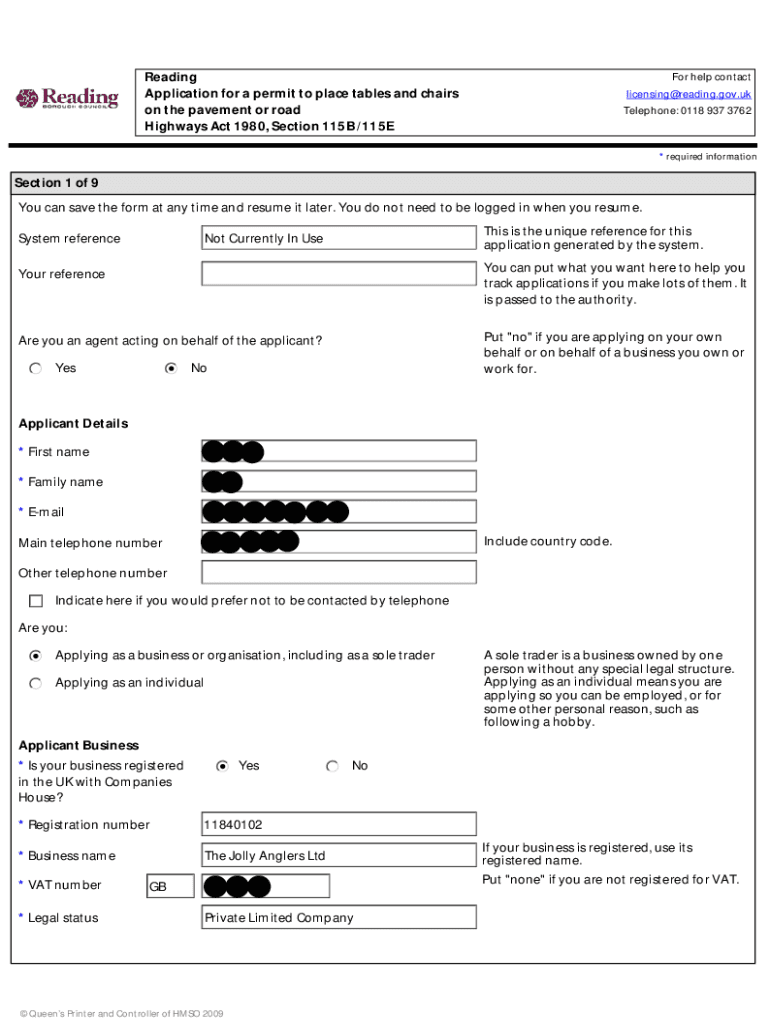 Reading Application for a permit to place tables and chairs on the pavement or road Highways Act 1980, Section 115B /115EFor help contact licensing@reading.gov.uk Telephone: 0118 937 3762* required