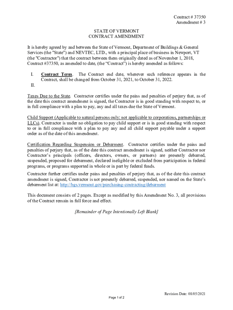 Contract # 37350 Amendment # 3 STATE OF VERMONT CONTRACT AMENDMENT It is hereby agreed by and between the State of Vermont, Department of Buildings & General Services (the \” State\”) and NEVER,