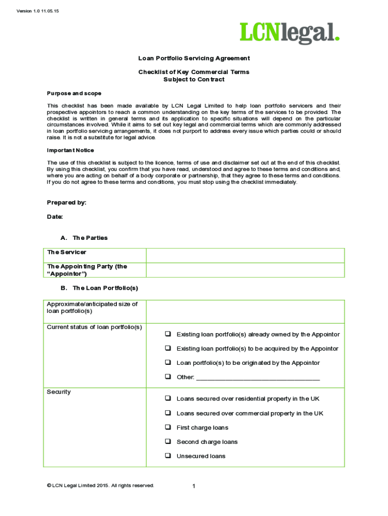 Version 1.0 11.05.15 Loan Portfolio Servicing Agreement Checklist of Key Commercial Terms Subject to Contract Purpose and scope This checklist has been made available by LCN Legal Limited to help