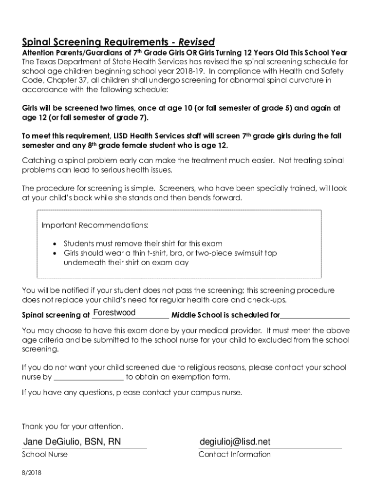 Spinal Screening Requirements Revised Attention Parents/Guardians of 7th Grade Girls OR Girls Turning 12 Years Old This School Year The Texas Department of State Health Services has revised the spinal