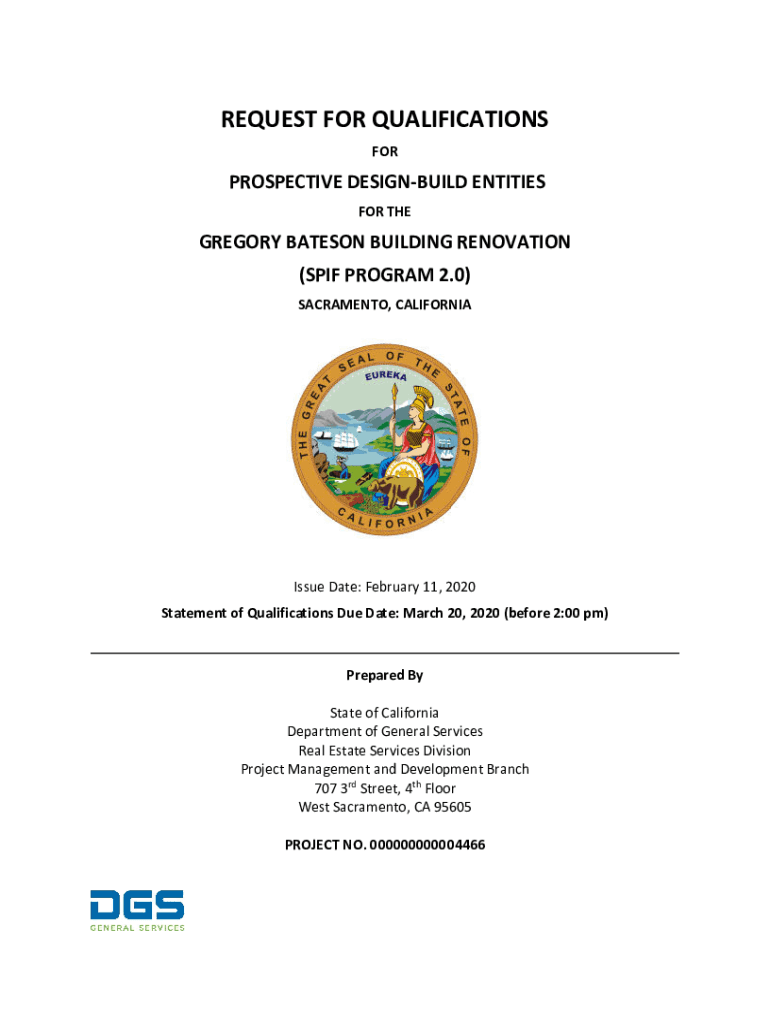 REQUESTFORQUALIFICATIONS FORPROSPECTIVEDESIGNBUILDENTITIES FORTHEGREGORYBATESONBUILDINGRENOVATION (SPIFPROGRAM2.0) SACRAMENTO, CALIFORNIA Issue Date:February11,2020 StatementofQualificationsDueDate:March20,2020(before2:00pm)