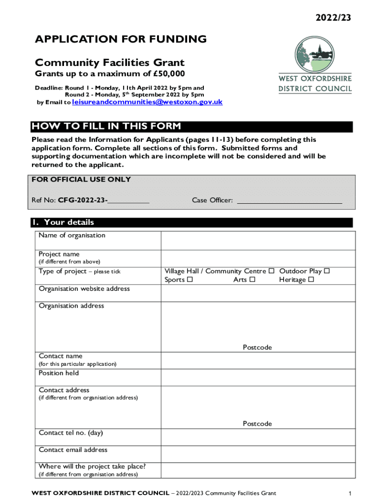 2022/23APPLICATION FOR FUNDING Community Facilities Grant Grants up to a maximum of 50,000 Deadlines: Round 1 Monday, 11th April 2022 by 5pm and Round 2 Monday, 5th September 2022 by 5pm by Email