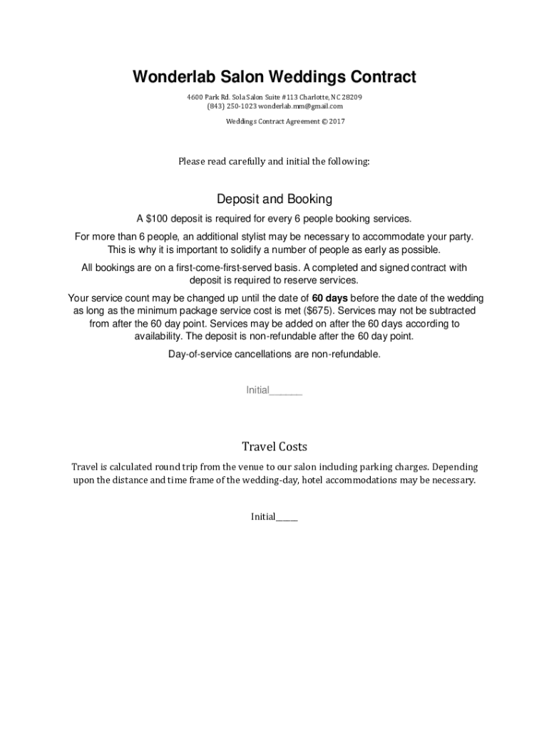 Wonder lab Salon Weddings Contract 4600 Park Rd. Sold Salon Suite #113 Charlotte, NC 28209 (843) 2501023 wonderlab.mm@gmail.com Weddings Contract Agreement 2017Please read carefully and initial the