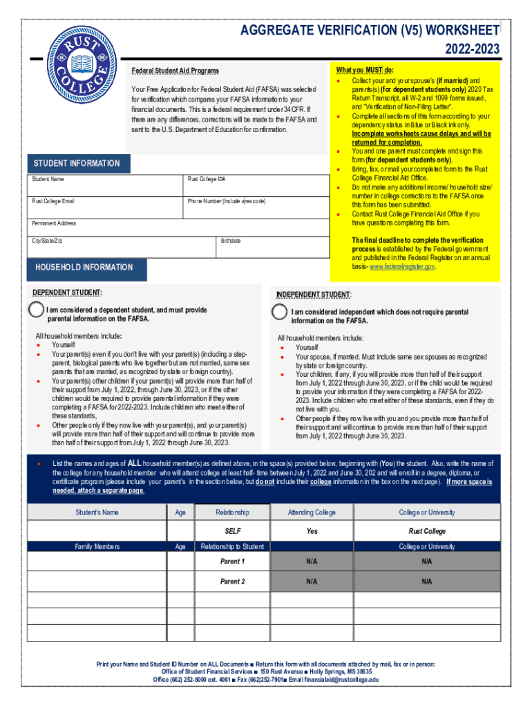 AGGREGATE VERIFICATION (V5) WORKSHEET 20222023 Federal Student Aid Programs Your Free Application for Federal Student Aid (FAFSA) was selected for verification which compares your FAFSA information